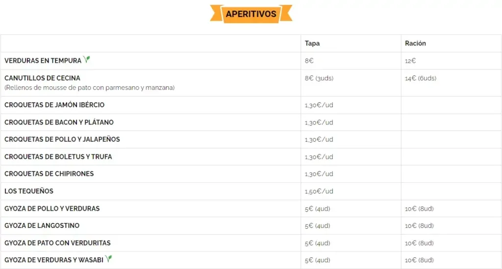 | Canutillos de cecina rellenos de mousse de pato | €14,00 |